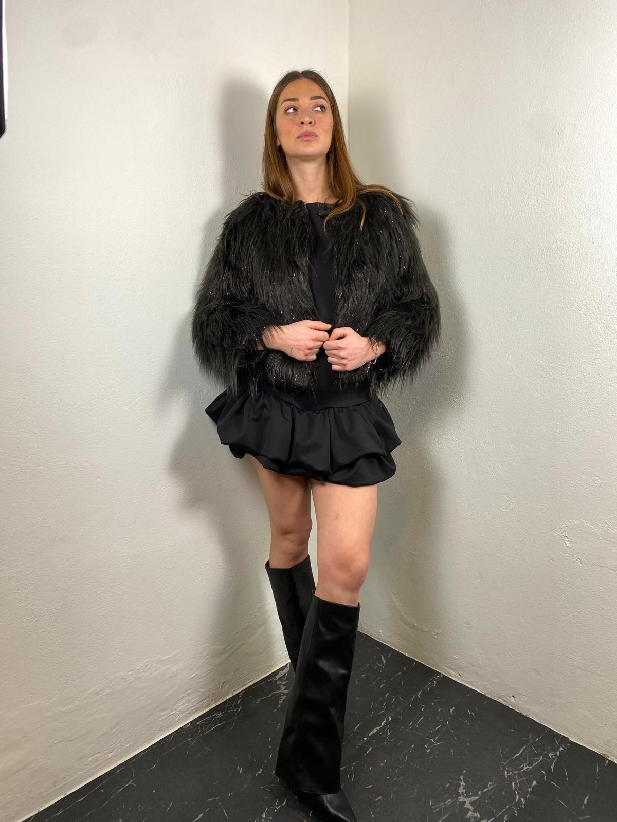 pellicciotto crop a pelo lungo con inserti in lurex, il colore del pellicciotto è nero tendente al verdone